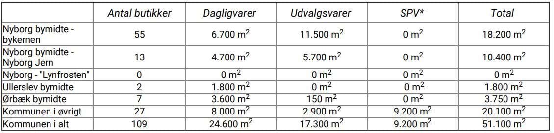 Tabel: Arealudlæg til detailhandel i Nyborg Kommune fordelt på områder i detailhandelstrukturen og hovedbrancher.
