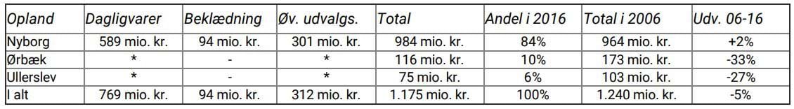 Tabel: Omsætning i detailhandlen i Nyborg Kommune 2006 og 2016.
