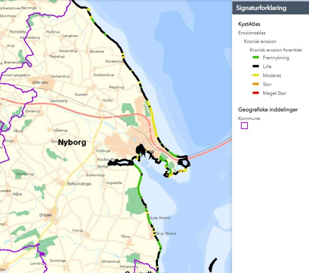Nyborg Kommune vurderer ikke, at der med det nuværende vidensniveau kan laves en nærmere udpegning af områder i risiko for erosion frem mod fx 2050. Nyborg Kommune vil i planperioden løbende vurdere, hvorvidt udpegningen kan konkretiseres.