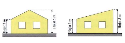 - Sommerhuse må max. etableres i 1 etage, med en max. bygningshøjde på 5 meter til tagryg og max. 3 meter facadehøjde langs mindst en langside som vist på nedenstående figur.