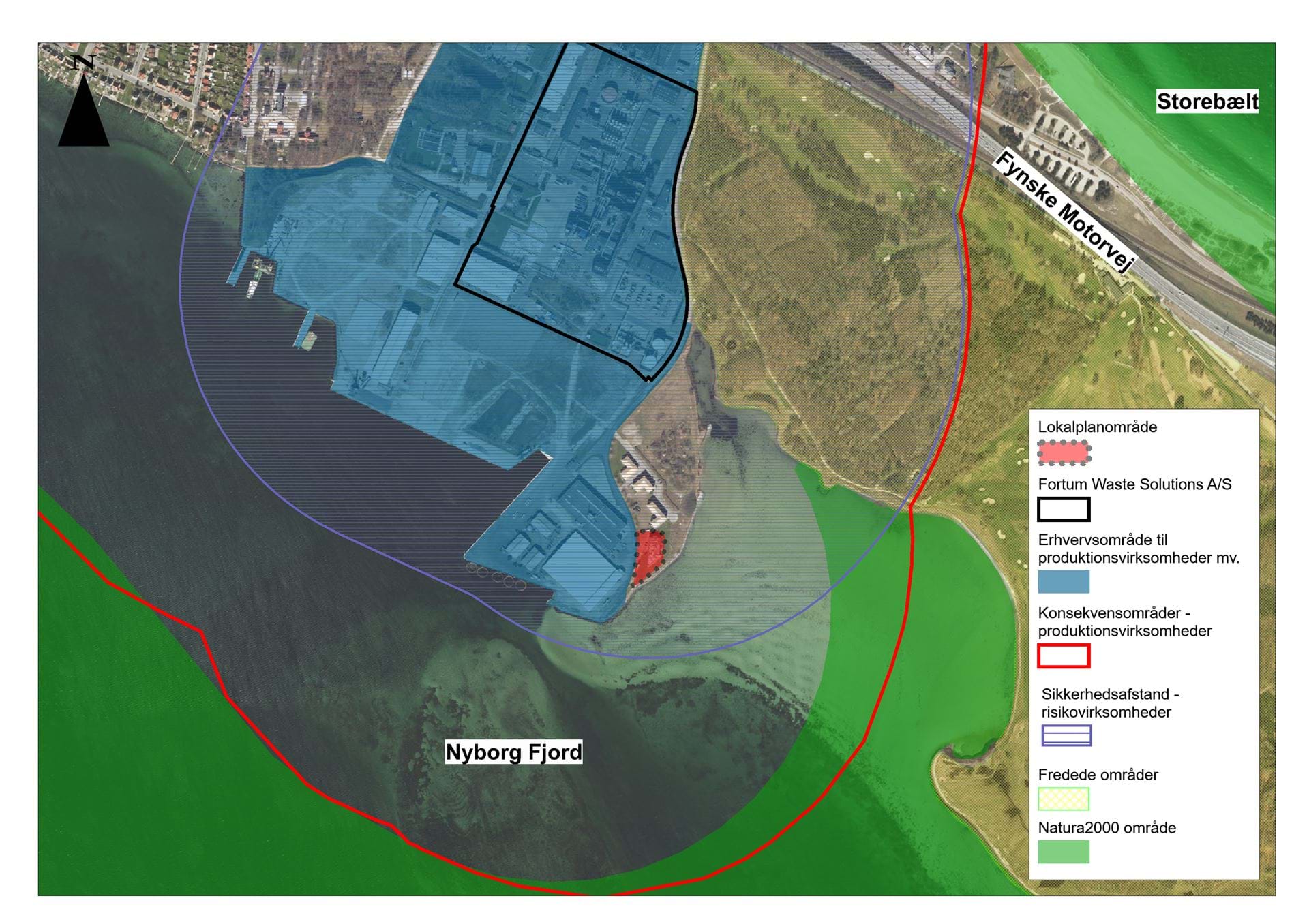 Figur 2: Beskyttelsesforhold i planområdets nærhed: Natura2000 område, fredede arealer, erhvervsområder forbeholdt produktionsvirksomheder mv., konsekvenszone heromkring og sikkerhedsafstand omkring risikovirksomheden Fortum Waste Solutions A/S.