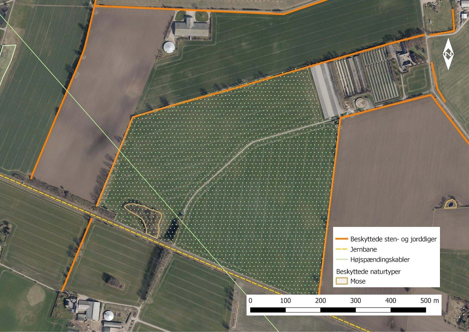 Kortet viser placeringen af den §3 beskyttede mose i den sydlige del af planområdet. Herudover viser kortet områdets beskyttede jorddiger.
