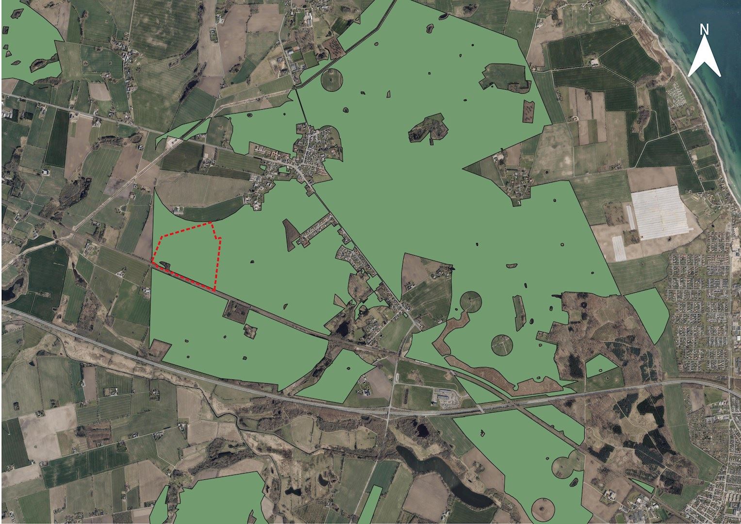Kortet illustrerer et udsnit af områder udpeget til positiv skovrejsning i kommuneplan 2021 inkl. markering af det aktuelle planområde.