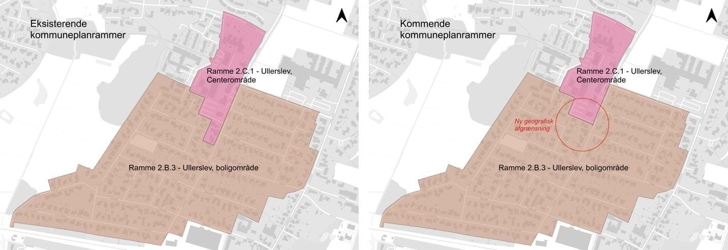 Kortene viser de to eksisterende kommuneplanrammer, som berøres af kommuneplantillæg nr. 7, samt ændringen i rammernes geometri.