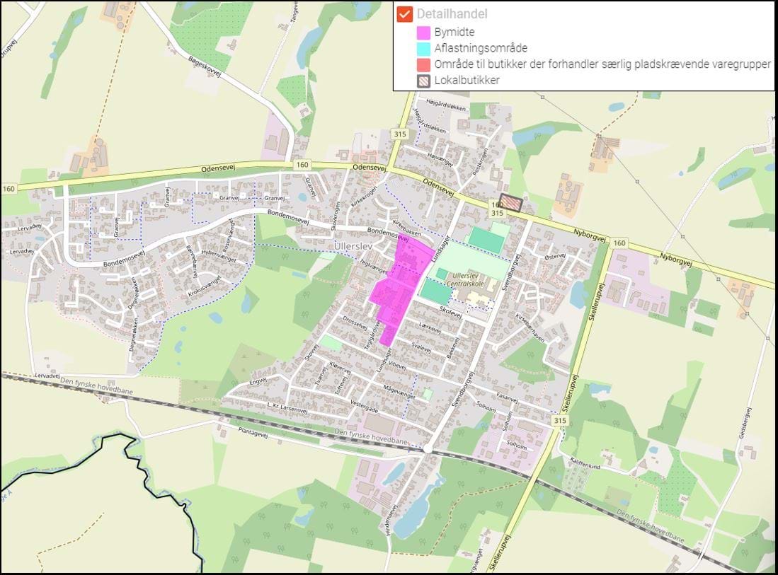 Kortet stammer fra Kommuneplan 2021 og viser den nuværende detailhandelsstruktur for Ullerslev.
