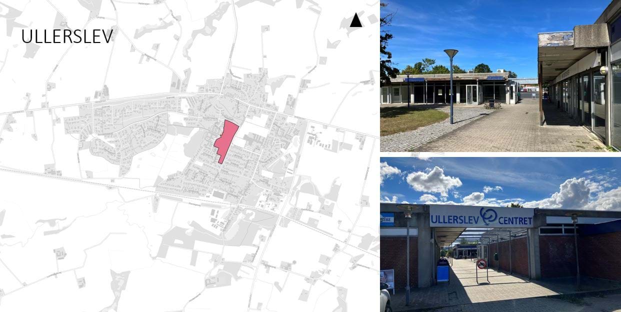 Kort, der viser centerområdet i Ullerslev og fotos fra centerbebyggelsen.